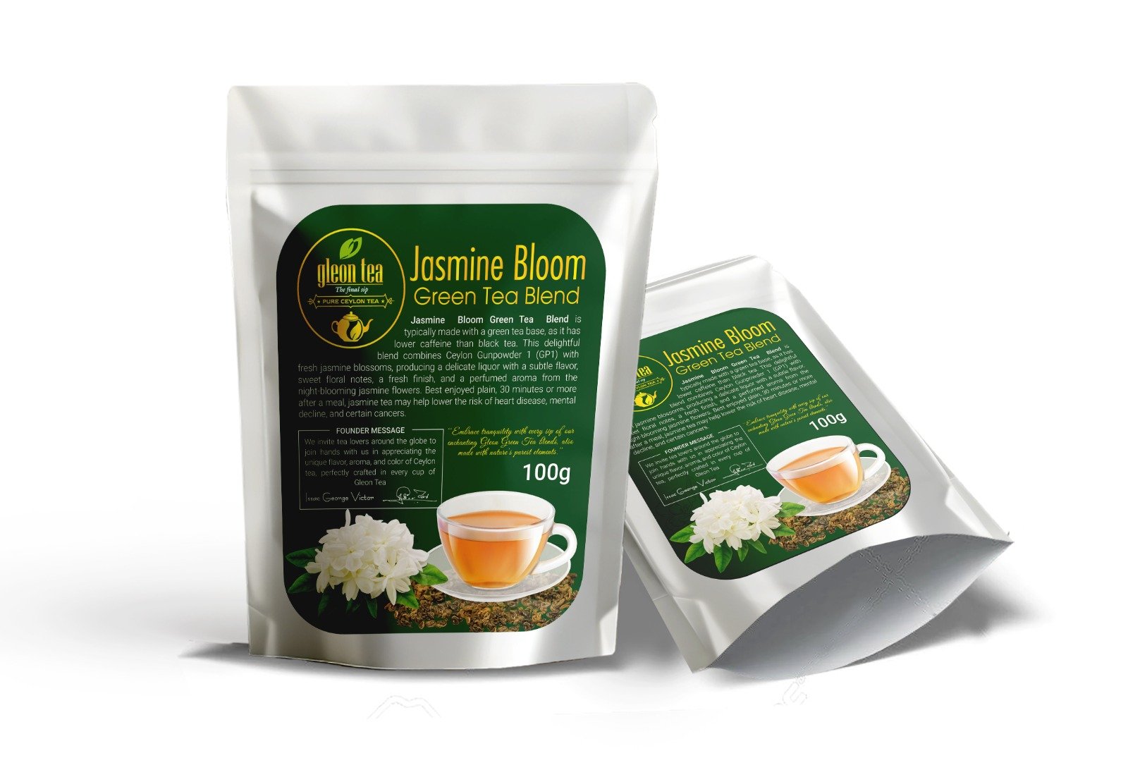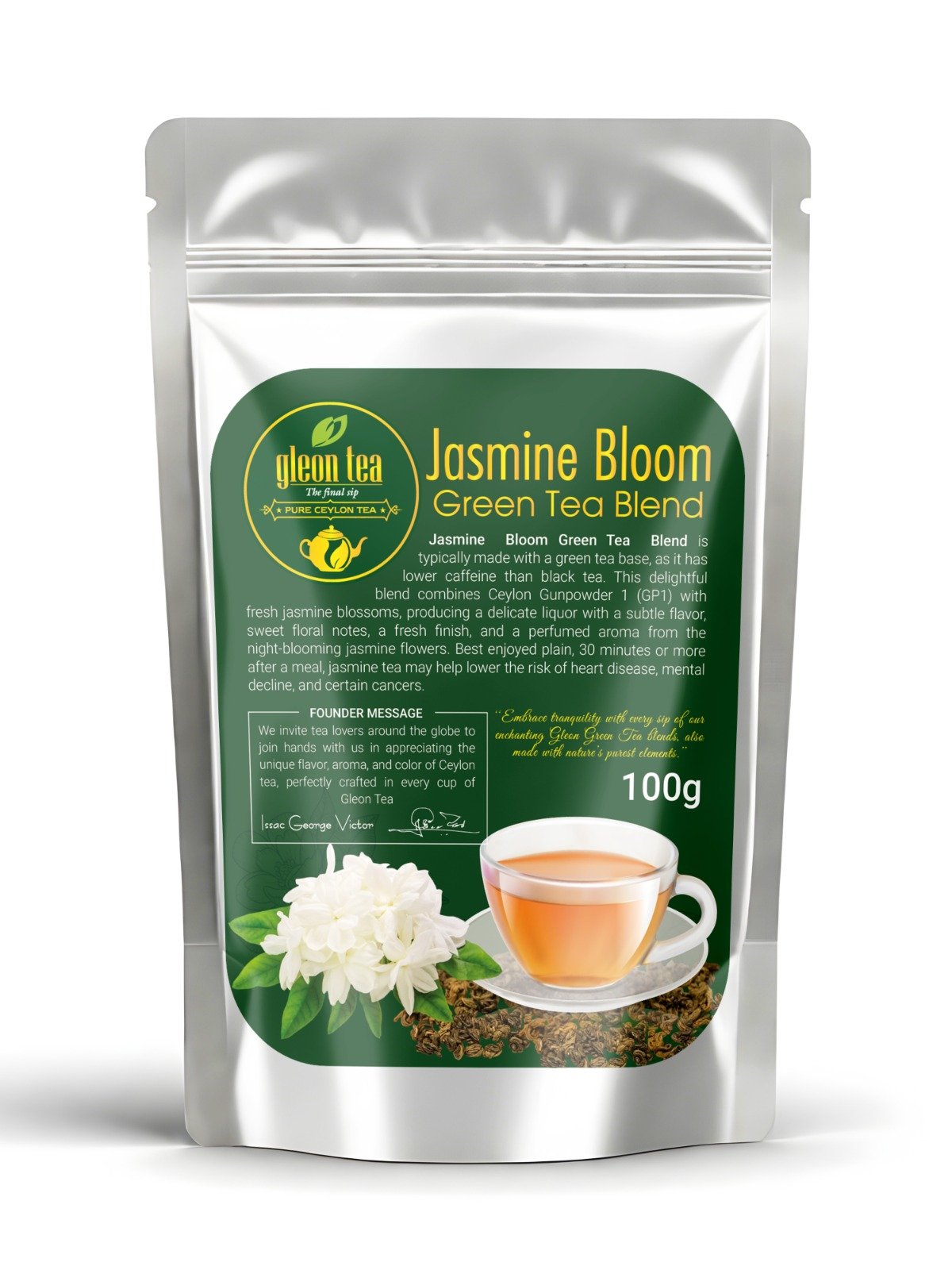 Jasmine Bloom is crafted with chinese tradition pan-fixation and jasmine petals, this tea offers a delicate floral aroma layered over a smooth, slightly sweet green tea base. The caffeine level is medium, making it calming yet gently uplifting. It brews into a pale yellow-green cup that reflects its light and elegant nature. This tea is made from Jasmine petals and Camellia sinensis leaves and buds that have not undergone the same withering and oxidation processes used to make black tea. As with most conventions, the usual way of drinking green tea is without milk.