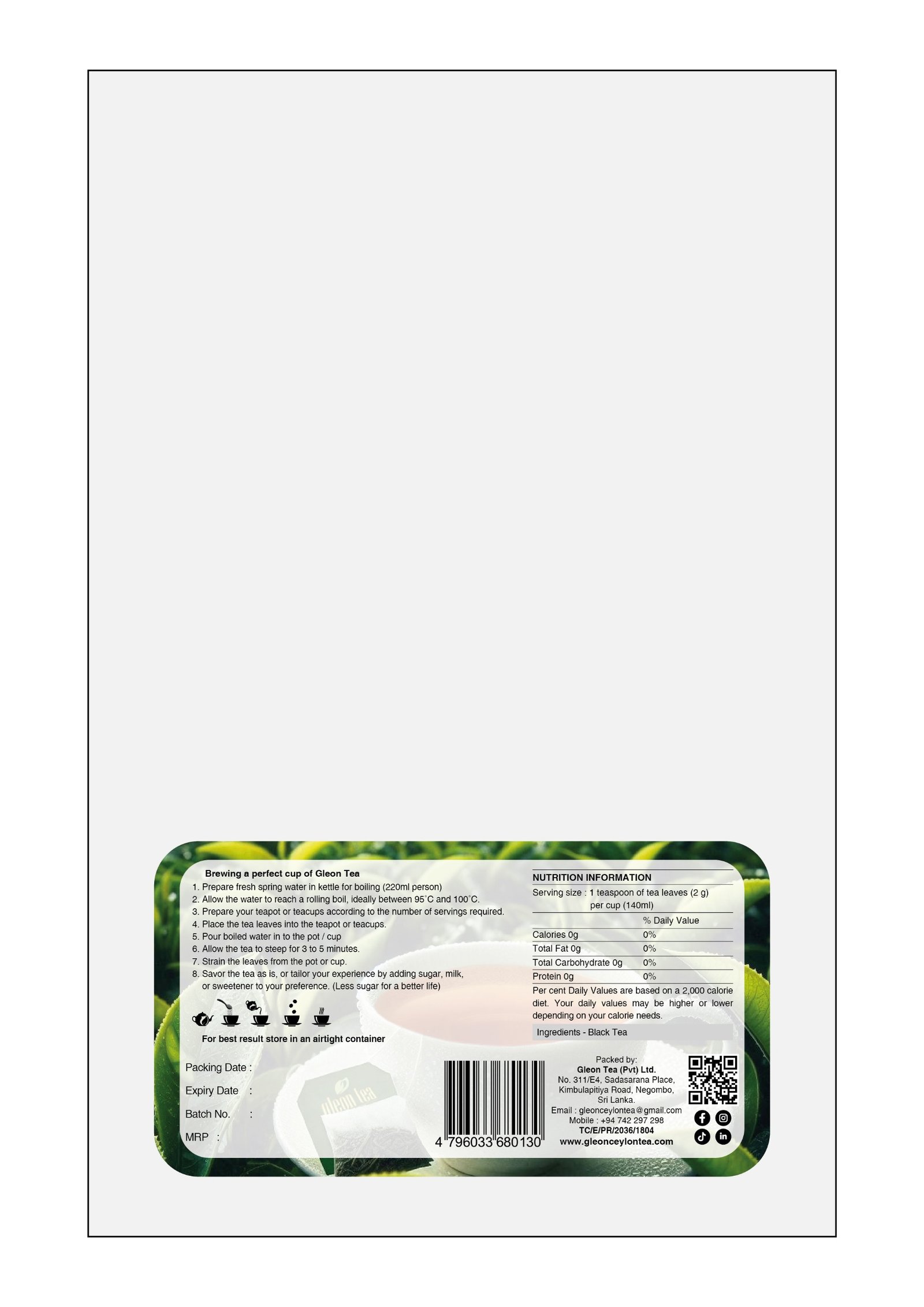 PURE CEYLON TEA ⭑ Royal Leaf presents the exquisite Sabaragamuwa Sri Lankan Region (FBOPF1) Flowery Broken Orange Pekoe tea, a splendid example of Ceylon’s finest offerings. Distinguished by its appealing tips, this tea is a harmonious blend that is smaller and shorter than BOP1, yet larger than FBOPF1, with a prefer- enhance for the presence of tips. Hailing from the renowned Sabaragamuwa region, celebrated for its top-quality tea leaves, this blend brews into a cup with unique character. The liquor showcases a rich, reddish hue, while the taste is both rich and gentle, offering delightfully sweetish notes.