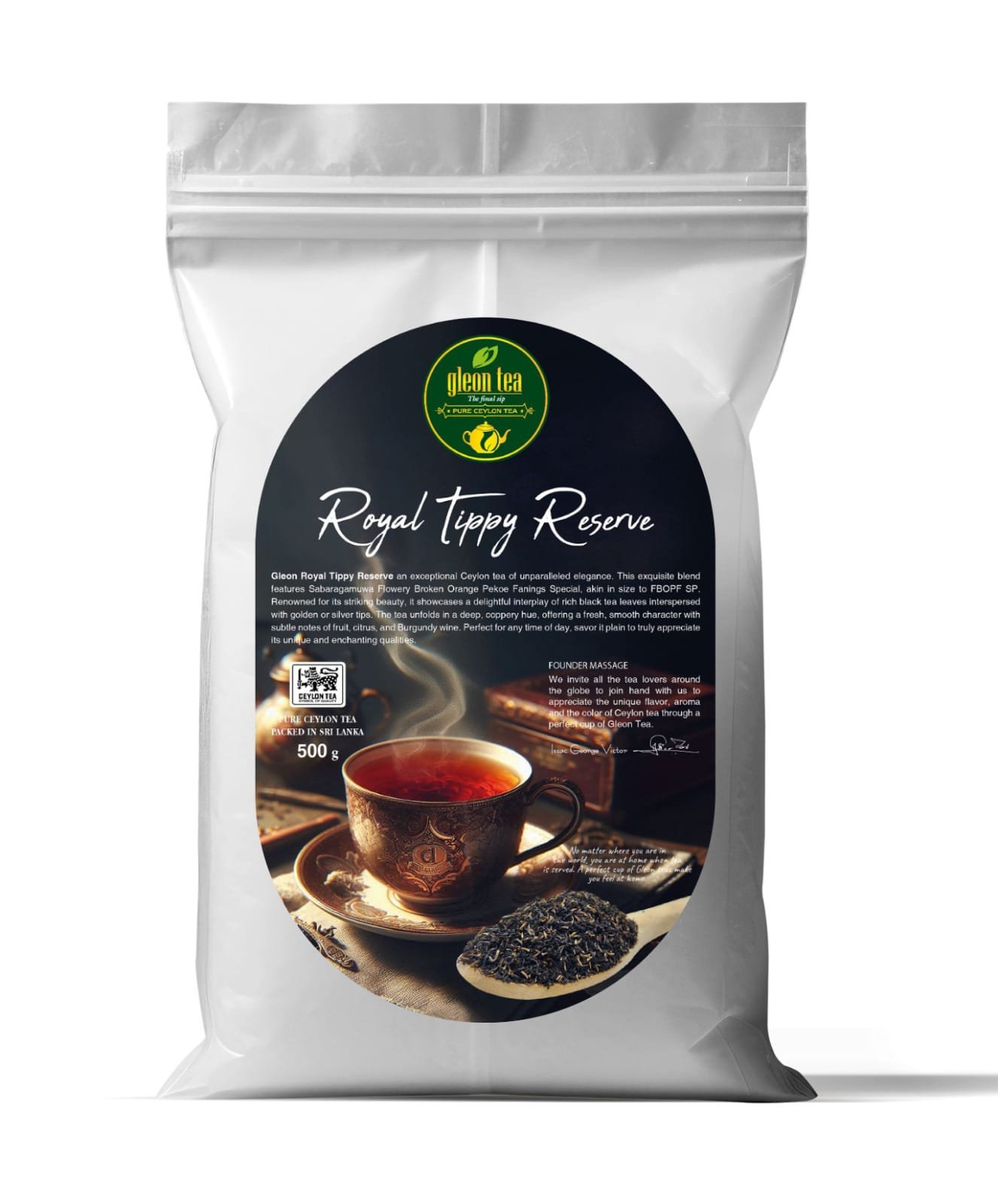 GLEON tea The final sip * PURE CEYLON TEA X Royal Tippy Reserve GLEON Royal Tippy Reserve an exceptional Ceylon tea of unparalleled elegance. This exquisite blend features Sabaragamuwa Flowery Broken Orange Pekoe Finings Extra Special, akin in size to FBOPF SP. Renowned for its striking beauty, it showcases a delightful interplay of rich black tea leaves interspersed with golden or silver tips. The tea unfolds in a deep, coppery hue, offering a fresh, smooth character with subtle notes of fruit, citrus, and Burgundy wine. Perfect for any time of day, savor it plain to truly appreciate its unique and enchanting qualities.